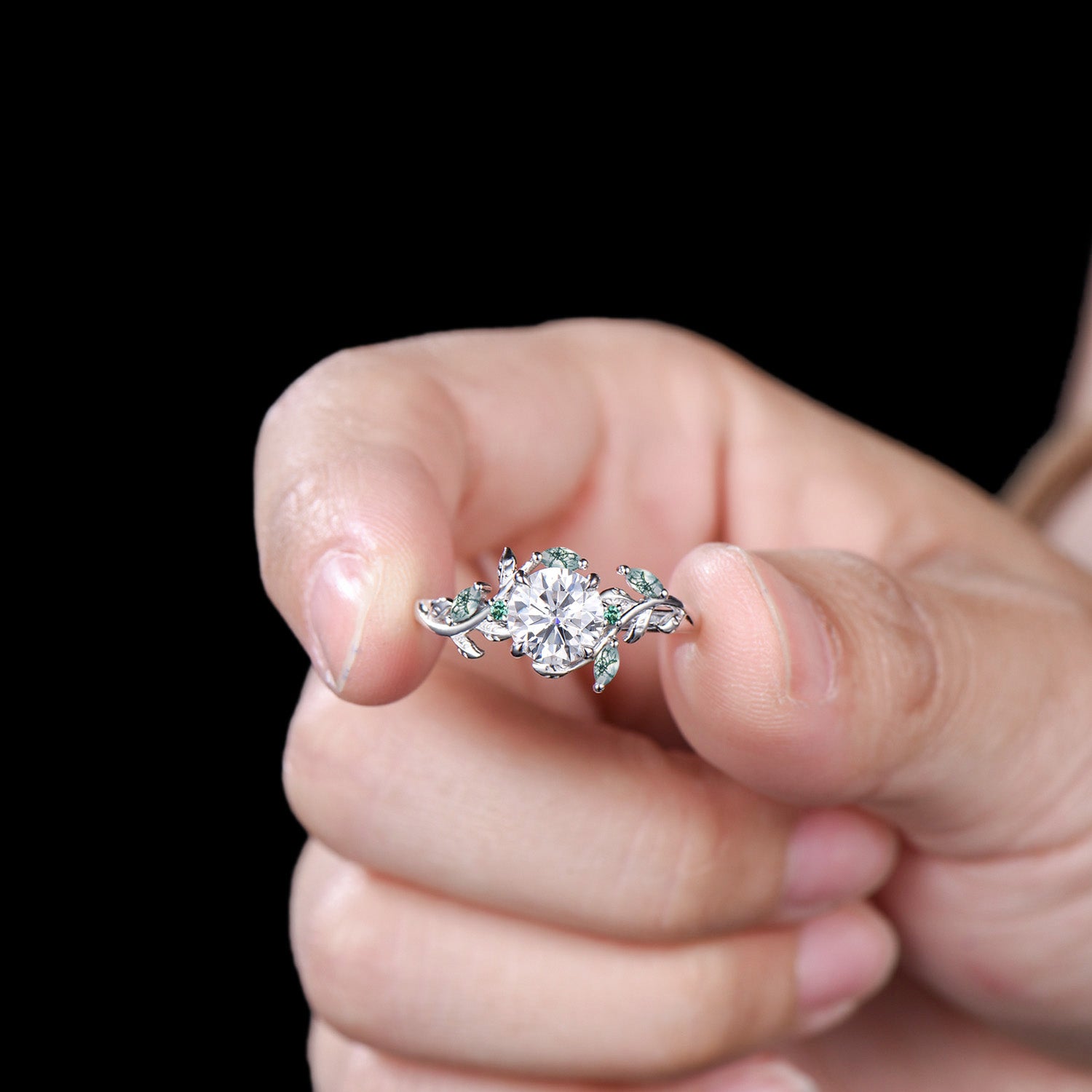 1 Carat round brilliant diamond engagement ring Nature Inspired moss agate twig vine wedding ring IGI certificate CVD diamond promise ring