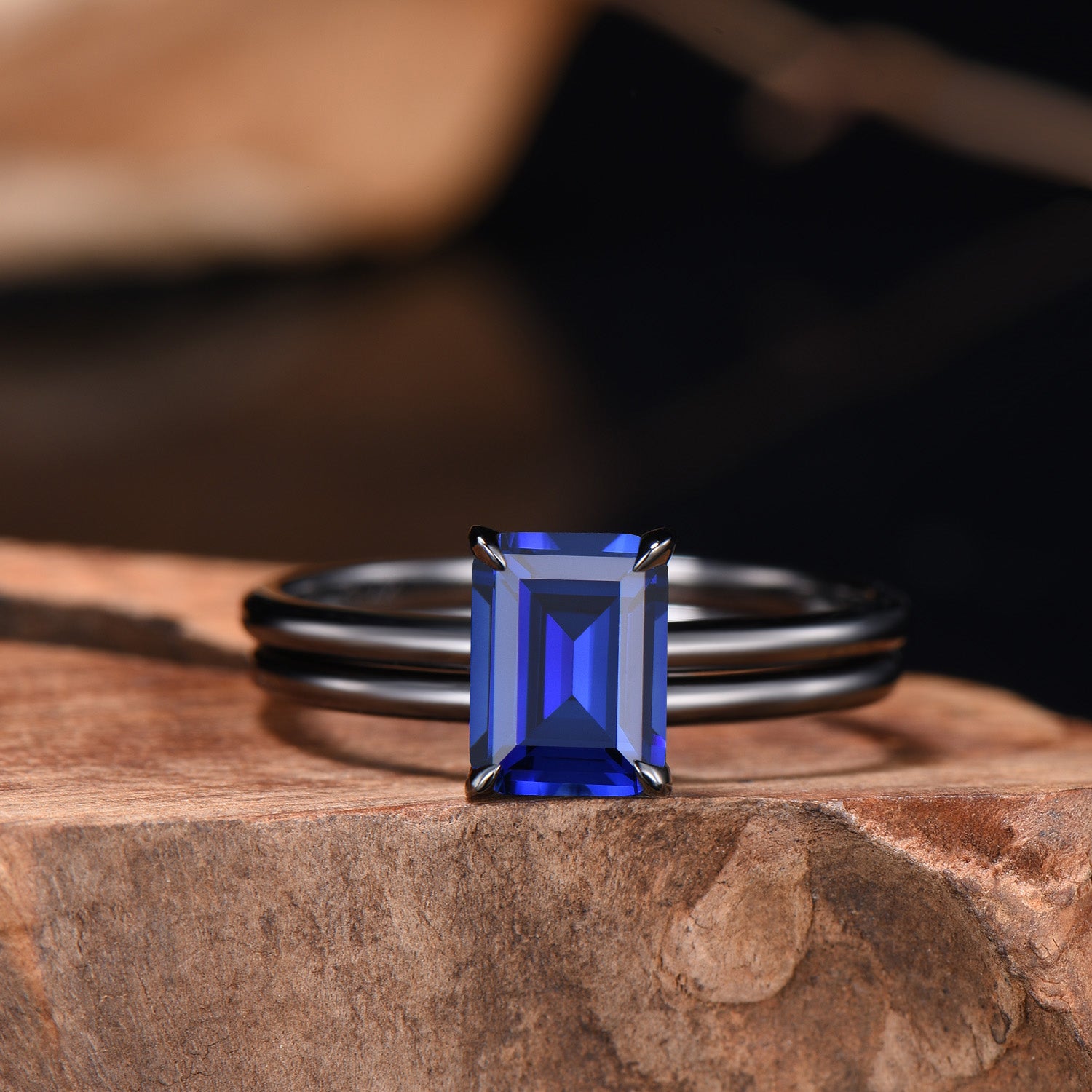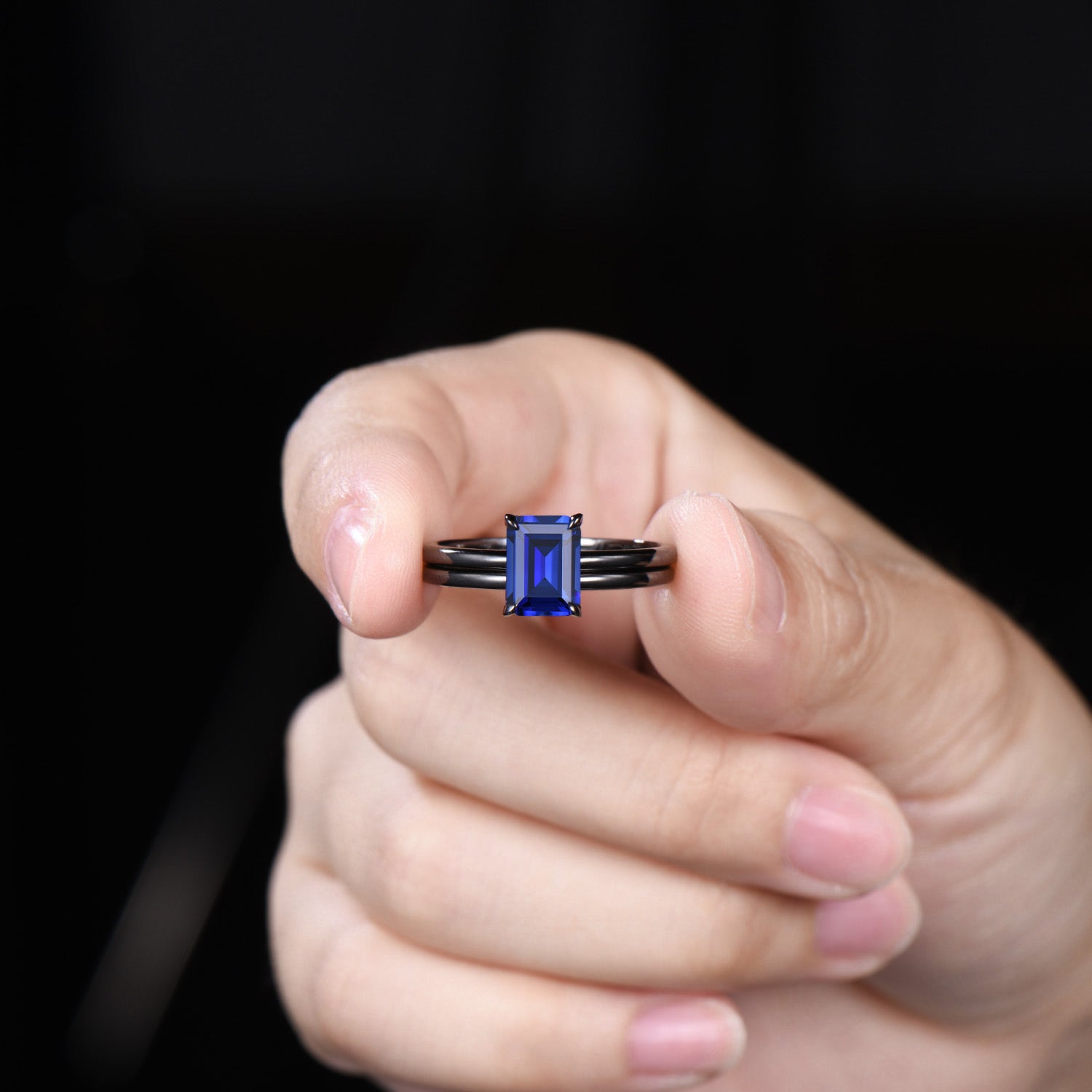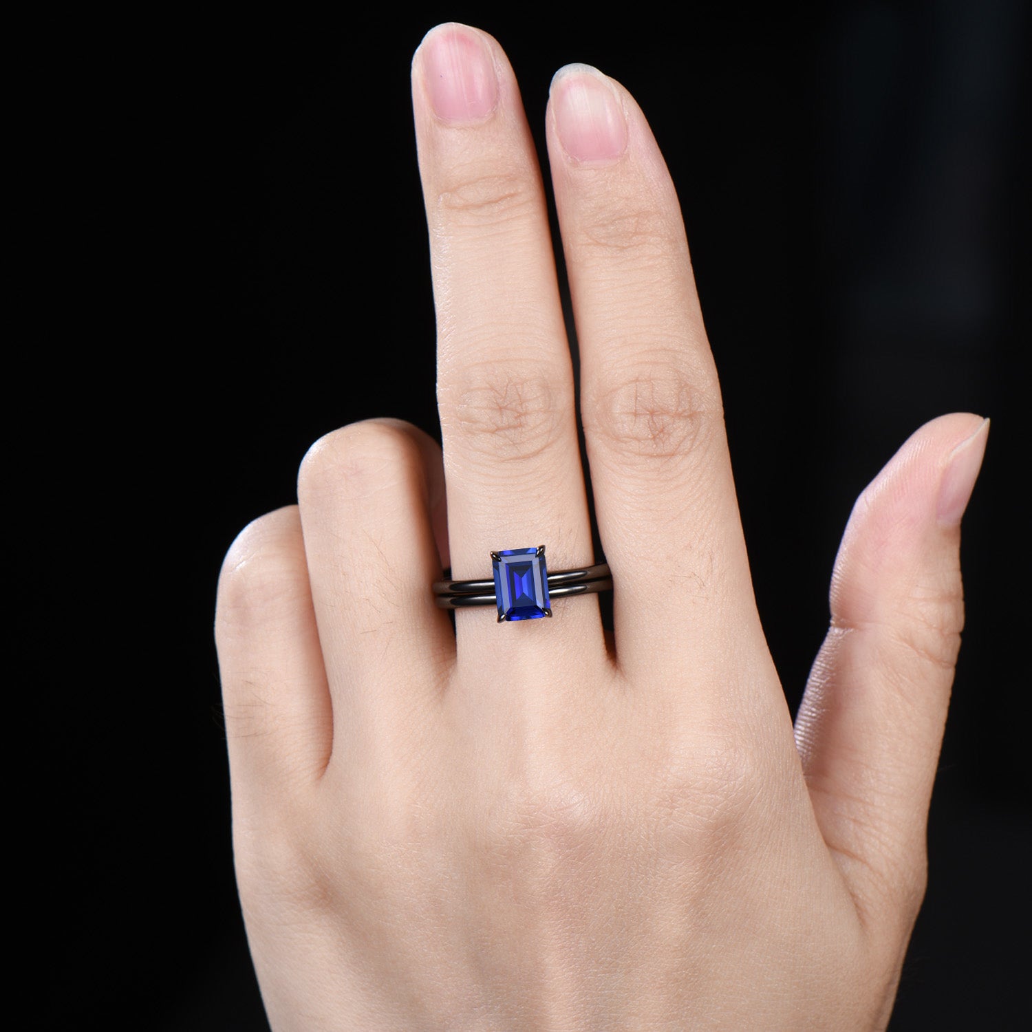 Minimalist Black Gold Emerald Cut Sapphire Engagement Ring Solitaire September Birthstone Wedding Ring Set Simple Anniversary Gifts Handmade