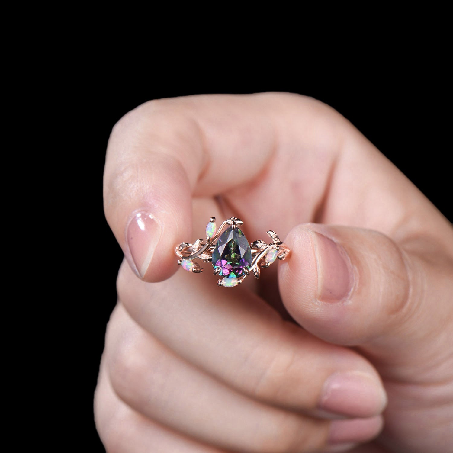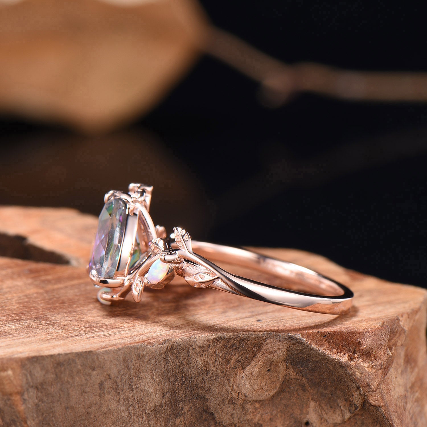 Nature Inspired Pear Shaped Mystic Topaz Ring Marquise Opal Twig Rainbow Topaz Engagement Ring Leaf Vine Rose Gold Anniversary Promise Gift